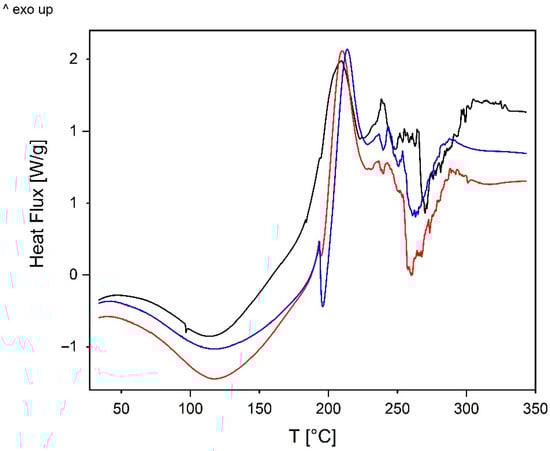 DSC chart in argon: ALG (black line), ALG/Ag/GOX (blue line), ALG/Au/GOX (red line).