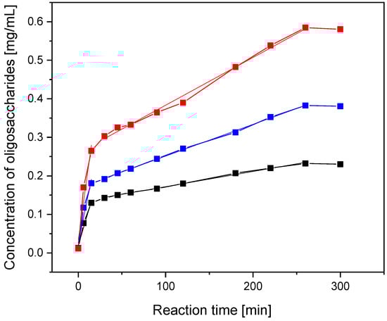 The two-step hydrolysis reaction of materials by alginate lyase is a zero-order reaction, where v = k (curves depicting oligosaccharides vs. reaction time are linear (Figure 8)). The reaction rate constants of each step were determined by a graphical method (linear regression) [47]. The inverse value of the line slope coefficient equals the value of the reaction rate constant (Table 3).