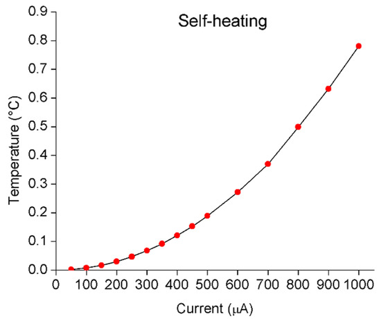 Figure 8 shows the control and readout electronics for the microsensors temperature measurements. The microsensors readout electronics require a precision power source for excitation, especially when a high resolution is required. Any fluctuation of the excitation current will originate a change in the electrical potential of the sensors, and consequently, will provide inaccurate temperature values. So, an adjustable current source (LM134 from Texas Instruments, Dallas, TX, USA) was used to provide a stable current of 100 µA. This device was chosen because it allows a current adjustment from 1 µA to 10 mA, with high accuracy and low noise. The supply of the circuit was performed by batteries for assuring independence of the power supply and portability.