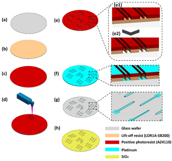 Schematic diagram of temperature microsensors patterning process: (a) glass wafer; (b) LOR1A-SB200 lift-off resist; (c) AZ4110 positive photoresist; (d) UV exposure; (e1) developed resist and (e2) LOR; (f) platinum deposition; (g) removal of the lift-off resist; and (h) deposition of SiO2.