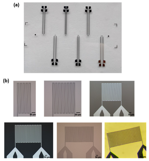 (a) Photographs of the fabricated temperature microsensors and (b) detail of the different windings (line width and spacing of 10 µm).