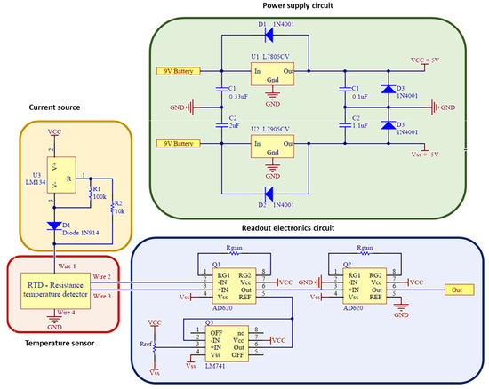 The high-sensitivity and noise-free RTDs readout circuit usually relies in a Wheatstone bridge or a four-wire configuration analog circuit for sensor output [25]. In this particular case, a four-wire configuration was used, which features high accuracy and an output voltage directly proportional to the RTD resistance only (Figure 8). The analog signals of the RTDs circuit were amplified using the AD620 from Analog Devices and converted into a usable voltage level for the microcontroller’s Analog Digital Converter (ADC), and for further stored in a SD card or presented in a display.