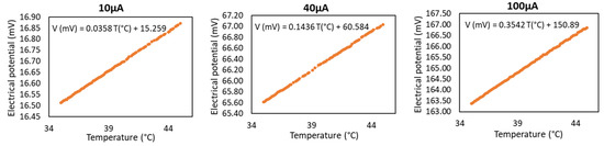 After successful fabrication, temperature measurements with the fabricated sensors were performed. The apparatus used comprised a programable current DC source (Yokogawa 7651) for supplying the sensors (excitation) when characterizing their single performance, a hotplate (Präzitherm type PZ28-2, 1100 W) and a peltier module as heating sources to control the temperature in the sensors, a digital multimeter (Agilent 34410A 61/2) connected to a computer, a custom-made software to continuously read the electric signals from the sensors and a picoammeter (Keithley 6487) for reading, with precision, the current flowing by the sensor (Figure 7).