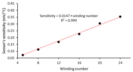 To evaluate the sensitivity and linearity of the sensors with 5, 8, 12, 16, 20 and 24 windings to monitor the temperature of the surrounding environment, preliminary tests were performed (using the experimental setup described in Section 2.4), measuring the electrical potential of those RTDs with the constant excitation current of 100 µA. The RTDs were placed in a temperature-controlled hotplate, for calibration. The temperature was increased from 35 to 45 °C with increments of 0.1 °C. Figure 10 and Figure S3 in the Supplementary Information shows the RTDs response. As expected, it is evident there is a high linearity between temperature and electrical potential. Furthermore, when the number of windings is increased, the sensitivity also increases linearly (cf. Figure 11). The experimental sensitivity ranges of the sensors from 0.0719 to 0.3542 mV/°C for 5 to 24 windings, respectively, which are close to the simulated values (0.1022 to 0.3966 mV/°C), are shown in Table 2. However, the experimentally measured electric potential was slightly higher than those obtained in the simulations, which can be explained by the increase of the electrical resistance of lead wires used in the electronic circuit connections. However, the RTDs performance is in agreement with the simulated results. Since the higher sensitivity was obtained for the 24 windings sensor, ~35 µV for a step of 0.1 °C, this geometry was chosen for being integrated in the organ-on-a-chip. The calibration equation for the sensors with 24 windings is expressed as follows: