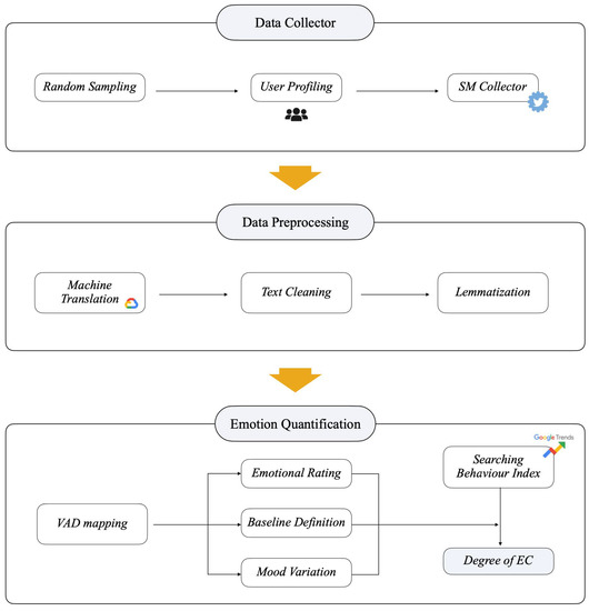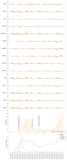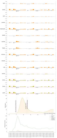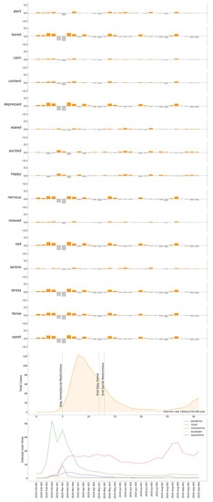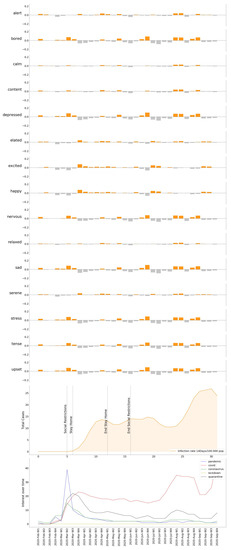 Since its first appearance at the end of 2019, the outbreak of the virus COVID-19 [1] led to a global pandemic, responsible for a dramatic loss of human life around the world [2] and still not under control, presenting an unprecedented challenge in our daily lives, as well as for public health, food systems, services, and the world’s economy [3,4]. The chain of events caused by the pandemic has taken a heavy toll on the economic and social aspects, increasing the number of people at risk of poverty, malnutrition, or mental problems [5]. Governments and companies have forced their employees to stay at home and ban many social activities in order to avoid contagion [6]. This situation of confinement, severe in some cases, has lasted for months in some countries, which has affected the mood and mental health of the population [7], as reflected in Figure 1. Human beings are fundamentally emotional beings. Our way of interacting with others is based precisely on the ability to communicate our emotions and to perceive the emotional state of others. By attempting to group emotions into classes or discrete units, numerous scholars and psychologists have dedicated their efforts to trying to conceptualize emotions. In this effort, authors have carried out surveys, studies, researches, and trials [8], giving birth to models that are able to classify emotions based on certain parameters. These models are mainly separated into two streams: discrete and dimensional models. Whereas discrete models focus on predefined, emotional categories, such as the six basic emotions: anger, disgust, fear, happiness, sadness, and surprise [9], dimensional models consider different values or factors to represent a mood or emotion in an n-dimensional space, contemplating a wider range of states.