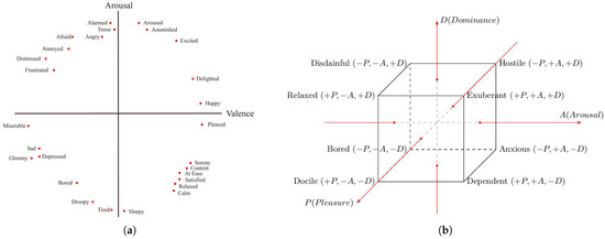 Dimensional models postulate that the basic building blocks or elements of emotions are dimensions such as arousal and valence. A first approach to dimensional models defined a three-dimensional model that includes three variables: pleasurable vs. unpleasurable, arousing vs. subduing, and strain vs. relaxation [27]. Later, James Russell developed a model in which he considered emotions to be distributed in a two-dimensional circular space, where valence and arousal would be the coordinates used to determine an emotion [28]. While valence (pleasure) represents the horizontal axis, differentiating positively from negative emotions, the vertical axis, represented by arousal or activation, comprises the variation between active and passive emotional states. At the center of the circle, where intermediate values for valence and arousal happen, the neutral state of affection can be found. This model rose up to be one of the most popular models up to date. Following this line, Albert Mehrabian joined Russell to create a more detailed, three-dimensional model that could describe and measure emotional states using three numerical variables: Pleasure, Arousal, and Dominance [29]. Pleasure and Valence are indifferently interchanged, meaning that PAD and VAD refer to the same three dimensions of this model. While valence and arousal are key drivers when identifying emotions, dominance is often omitted, leading to Valence–Arousal models, such as the previously mentioned Circumplex Model. Lang and Bradley also argued that the combination of the dimensions of arousal and valence, when combined, forms an appetitive and aversive emotional orientation, with arousal being a measure of intensity of said emotional orientation and valence the emotional direction, with pleasant being appetitive and unpleasant being aversive [30].