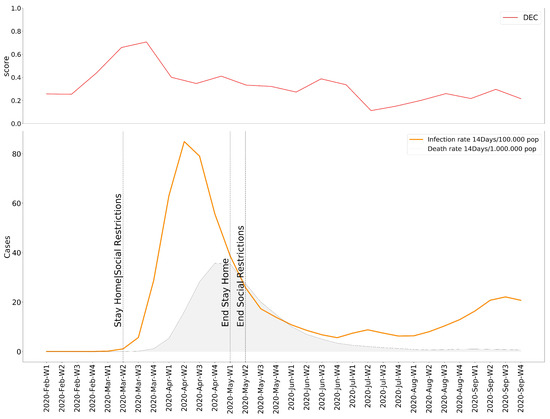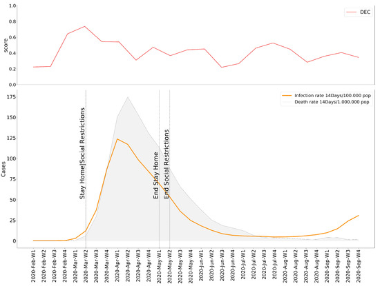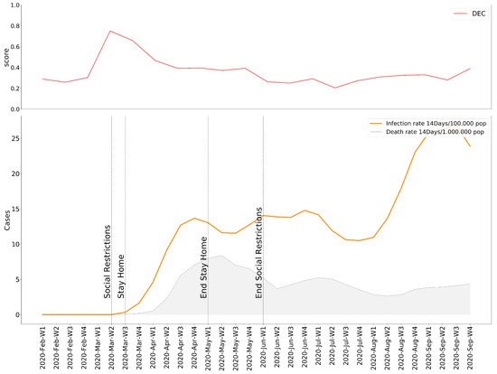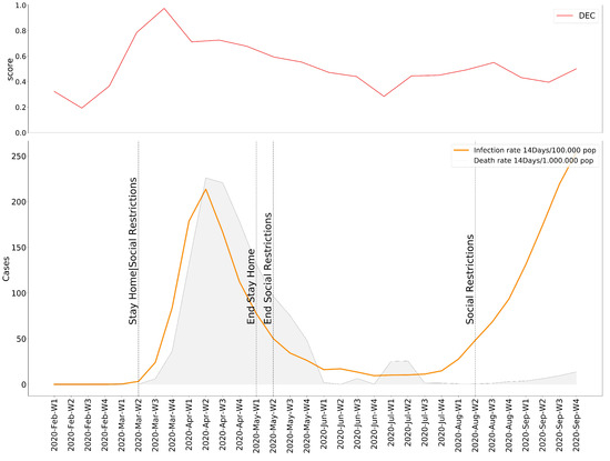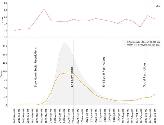 This concurs with findings from other authors, where social media monitoring revealed an increase in emotions such as anger, fear, and anxiety soon after the beginning of the pandemic [46]. Psychology also shows that people tend to feel anxious and unsafe in response to environment changes, especially in the case of disease outbreaks, when the cause or progression of the disease and outcomes are unclear, rumors grow and close-minded attitudes eventuate [47]. In most countries, during the first phase of the pandemic, rates for depression, anxiety, and insomnia increased significantly in comparison to previous years, while these rates noticeably decreased as time passed since the beginning of the pandemic [48,49,50]. This observation may lead us to argue that, in general terms, a decrease in DEC means an adaptation or getting accustomed to living in such a tragic situation, where, although there is an increase in the cumulative incidence of COVID-19 cases, the response, if any, is not so negative. This aspect of acquired indifference has been studied numerous times in the field of human psychology, associated with the need for survival and resilience in the face of extremely aversive events [51]. Other authors already demonstrated that we not only become numb to the significance of increasing numbers, but our compassion can actually fade or collapse overall as numbers increase [52].