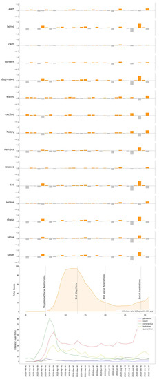 Once the necessary operations have been executed, we possess values for the Emotional Rating, Emotional Impact, and Emotional Baseline; all the ingredients we need to expose our results. Based on these variables, we present our observations as the individual variation of the degree of Emotional Concern as well as the 15 selected moods. In order to follow the evolution of the pandemic, we decided to help ourselves with the data of the accumulated incidence of 14 days of COVID-19 cases and deaths for each country [44], plus their respective response measures [45]. The results obtained in this experiment lead to the conclusion that, for most cities, the onset of the pandemic is received with a clear negative reaction—an increase in moods with a higher rate of displeasure in the Circumplex model (Figure 5, Figure 6, Figure 7, Figure 8, Figure 9 and Figure 10), associated with the exponential increase in cases nationwide. The degree of emotional concern (DEC) thus reflects an increase in concern about this growing number of infections. We could speak of a certain causality concerning DEC and the imposition of restrictive countermeasures on social activities and mobility, as a response to the gravity of the situation. At first glance, it is evident that the emotional response is not the same in all countries: we find similarities in Berlin, London, Madrid, and Warsaw (Figure 5, Figure 6, Figure 7, Figure 8, Figure 9 and Figure 10), where the DEC evolves with a decreasing trend concerning the initial peak, while in Rome and Paris that variation is not so tangible (Figure 8 and Figure 9).