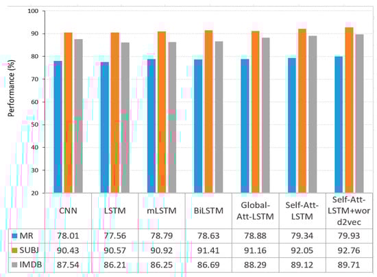 Overall, the attention mechanism consistently improves the accuracy of baseline models. From the experimental results, it is observed that the proposed deep neural networks utilizing attention mechanisms achieve very high performance, thus proving that they are potent and suitable tools for textual sentiment analysis as well as classification tasks in general. The classification performance that was achieved showcases the prowess and scalability of the proposed approach in analyzing users’ opinions and attitudes. Furthermore, the approach that achieved the highest accuracy across the board was an LSTM on top of pre-trained 300-dimensional word2vec embeddings, which are further refined through additional training. The experimental study revealed various rather interesting findings. The best accuracy result was reported by the self-attention-based LSTM with the addition of word2vec embeddings, consolidating the fact that the examined attention-based models lead to a performance gain of up to 3.5%.