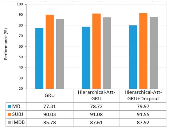 In the second experiment, we examine the performance of the hierarchical-attention mechanism. The results are quite interesting and showcase that baseline GRU models can achieve satisfactory performance. The implementation of hierarchical-attention mechanisms in GRUs can greatly outperform baseline GRUs in all the examined datasets. Indeed, the hierarchical attention GRUs improve performance over baseline GRUs by almost 2% in terms of accuracy. Additionally, utilizing a dropout technique proves to be quite useful in improving the accuracy of attention-based GRUs even further.