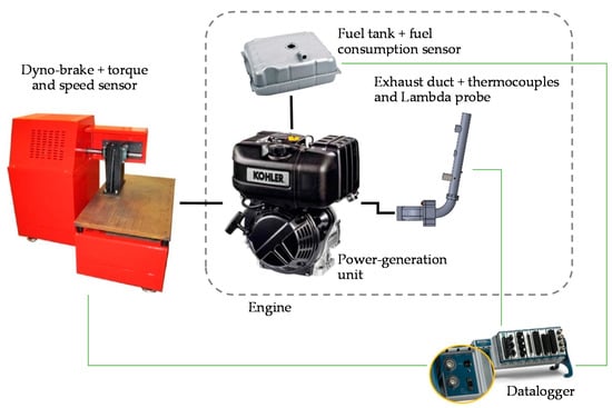 - The reference value for the EGT at the exhaust pipe inlet (i.e., the approximate temperature immediately after the exhaust valve), namely T, has been set at 750 K, a realistic value considering that the gas temperature at the end of the adiabatic expansion phase is typically between 550 and 650 °C (823.15–923.15 K) and the temperature of the EGT at the pipe outlet can be 220–250 °C (593.15–623.15 K). These data were found in literature in other works using diesel engines of the same size [32,61]; the lower and upper values were calculated from the same references;