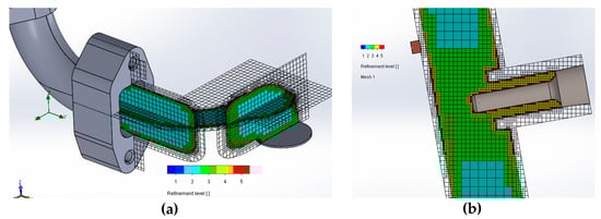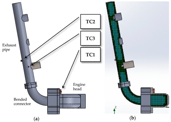 - The reference values for the emissivity of the materials (in the engine head simulacrum and the exhaust duct), their conductivity, and the contact thermal resistance were all found in the SolidWorks flow simulation database for the stainless steels with a surface roughness of 1.14 μm and a surface pressure of 40–70 atm in the bolted junctions. These values are in full accordance with the literature [65]. Upper and lower values of the emissivity were chosen with reference to other surface finishing and with the aim of having a wide range of possible variations (especially for the head, represented only in a conventional way, as indicated). Upper and lower values of the conductivity and thermal resistance were chosen by looking through other types of iron alloys and different contact pressures in the same database.