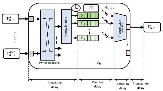 The capable switch described in IEEE 802.1Qbv must simultaneously realize fabric switching, filtering, and traffic policy selection for flows arriving from the ingress ports [19]. Fabric switching and filtering processes redirect the arrival of traffic to the appropriate priority queue, as depicted in Figure 2. Using the GCL timing schedule, the queued frames are selected to the egress port and then to the physical link. The frames experience related delay components during the transmission process to achieve these switching functions, as differentiated in Figure 2.