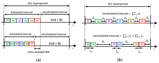 Different scheduling solutions have been proposed to ensure latency requirements for hard real-time flows and enhance AVB latency performance at the same time. As the GCL implementation is window based, each priority class has to transmit related traffic through the assigned windows. Different window patterns have been proposed to enhance the overall system performance, as discussed in Section 2. Most of the relevant researchers in the literature, e.g., in [10,11,12,13], have suggested allowing TT open windows to interfere with each other, leading to more available bandwidth for unscheduled transmissions. Although the researchers in [11,12] have improved the overall solution space, no one has optimized how much TT windows can be overlapped without missing TT requirements. Accordingly, this paper focuses on presenting an optimal formal solution for the scheduling problem based on TT open windows’ overlapping assumption.