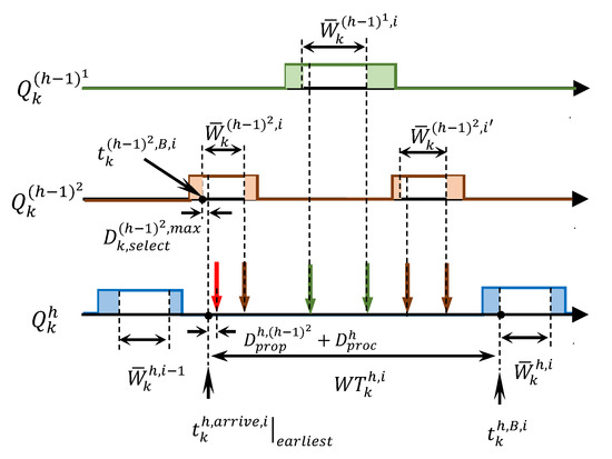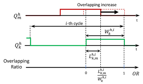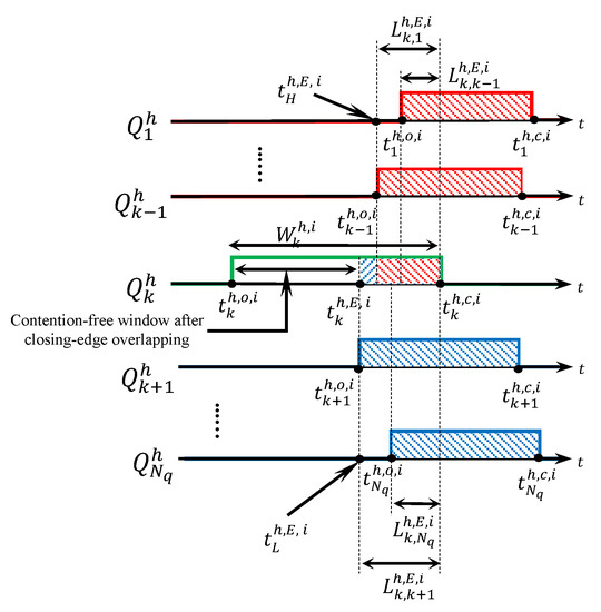 Higher-priority overlapping at the opening edge: The overlapping ratio between the window and the higher-priority window () at the opening edge can be determined by using Equation (6) as . Thus, the most decisive influence from the higher-priority overlapping at the opening edge, as shown in Figure 7, is included by considering only the queue that has the largest overlapping ratio with the window, as follows: