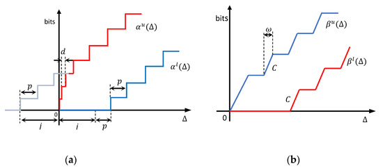 The arrival curve is modeled using the input traces and the traffic configuration, as combined in the triple , where represents the period of incoming streams, denotes the jitter, and is the lowest inter-arrival distance of traffic in the specified flow. Accordingly, the lower and upper arrival curves are formed as follows [48]: