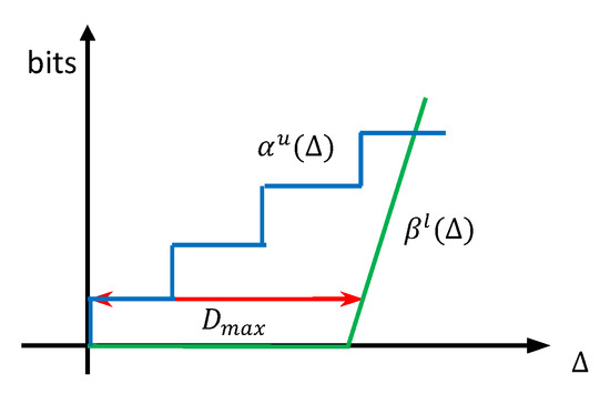 In each node, the traffic is expressed by the arrival curve at the ingress port and served by the egress port’s service curve. The worst-case latency boundaries are obtained by considering the maximum distance () between the upper-bound arrival curve ) and lower-bound service curve () [48], as represented in Figure 6.