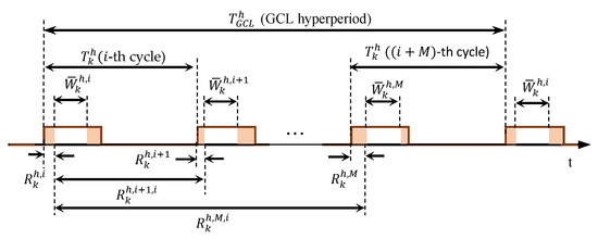 As mentioned, we consider as a targeted TT queue for latency calculations in any node . Then, to include the overlapping at the opening edge of the window, we assume that when its gate () changes from closed to open in the i-th gating cycle (at ), there is another TT gate open (), as depicted in Figure 7. The length of the overlapping interval between and any other TT queue () open windows can be found easily as