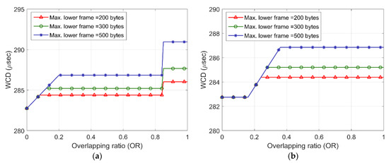 Cases 1 and 2: In these cases, the lower-priority overlapping is evaluated by varying the OR from 0 to 1, with different sizes of frames. Figure 14a,b shows the performance of the worst-case latency for traffic under opening-edge and closing-edge overlapping. As expected, the lowest is obtained under full isolation between and windows ().