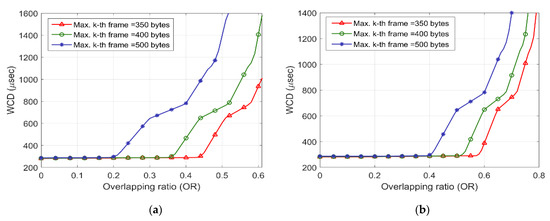 Cases 3 and 4: In these cases, the influence of the higher-priority overlapping at the opening edge and closing edge is evaluated in Figure 15a,b, respectively, with sizes of frames as 350, 400, and 500 bytes.