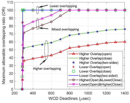 In contrast, higher-priority overlapping has the highest impact on the latency, and stricter overlapping constraints should be guaranteed. Opening-edge overlapping has a larger influence than closing-edge overlapping. For example, to meet the 400 µs latency deadline, the highest allowable OR at the opening and closing edges is 38.62% and 54.62%, respectively. Under two-sided higher overlapping, the performance is almost the same as under closing-edge higher overlapping, and the latency deadline of 400 µs is met until 54.31% overlapping.