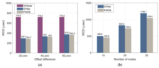 In Figure 17a, the comparison is performed under different window offsets between adjacent nodes (). FWOS gives the lowest WCDs compared with others. For a three-hop connection, FWOS reduces the WCD by 55% on average and 60.6% maximum compared with STNode and 3.03% on average and 3.4% maximum compared with STNet. The WCD enhancement of the FWOS algorithm increases under large use cases, as illustrated in Figure 17b. Compared with STNet, FWOS reduces the WCD by 9%, 11.5%, and 12.3% for connection with 10, 20, and 30 hops, respectively. The interpretation of that is our latency improvement depends linearly on the number of selected nodes, as can be noticed from Equations (28) and (38). Our model reduces end-to-end latency bound by a value equal to the propagation and technical switch delays in each link. Note that the STNode model is excluded in Figure 17b as it produced non-comparable latencies. The STNode model is implemented based on separate latency computations among nodes without considering the relative positional offsets between adjacent nodes. Undoubtedly, it has colossal WCDs compared with others.