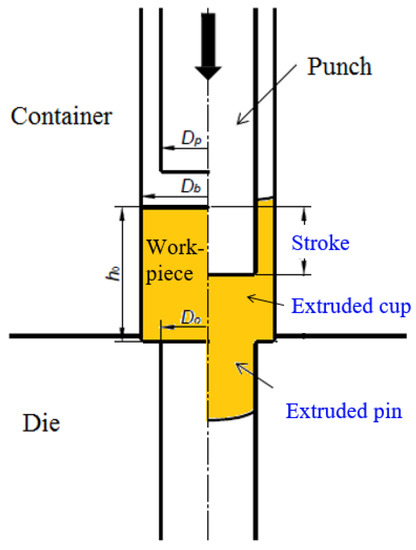 In this study, annealed ASTM A36 structural steel billets with a diameter of 25 mm and a height of 25 mm were used to investigate the forming defects of the CFBE process. The Young’s modulus was 200 GPa, and the Poisson ratio was 0.26. The CFBE experiments were conducted on a hydraulic press at 25 °C. The punching speed was 10 mm/s, and solid MoS2 powder was used as the lubricant.