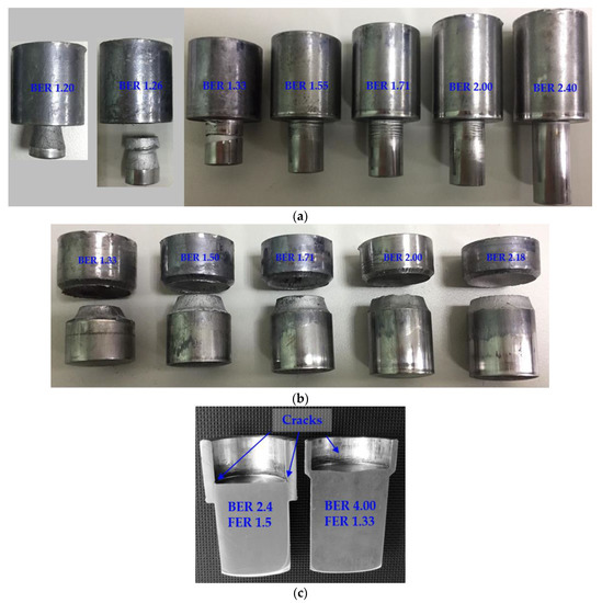 Figure 5a shows the photos of the representative forming defects for the BER ranging from 1.2 to 2.4 and the FER fixed at 4. Piercing defects appear at low BERs for 1.20 and 1.26. The forming defects transit to surface-cracks on the outer surface of the forward extruded pin when the BER is increased to 1.33. The surface-cracks become spotty and imperceptible when the BER is increased to 2.4, which makes it subjective in drawing the border line between the crack zone and the safe forming zone in