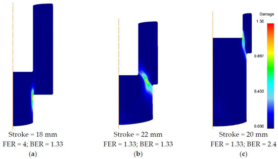 Figure 8a shows that large damage values appear on the outer surface of the forward extruded pin when the FER is larger than the BER. In practice with the CFBE, the occurrence of piercing or surface-crack defects might be misinterpreted as a “hole-punching effect” when the sizes of the punch and die outlet are similar.