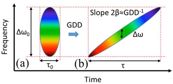 It is well known that the light pulse is considered transform-limited when the angular frequency is constant and equals the central angular frequency ω(t) = ω0. On the other hand, the chirp of an optical pulse is generally understood as the time dependence of its instantaneous frequency; thus, a chirped pulse having a carrier frequency ω0 at time t shows an instantaneous central frequency ω(t) that depends on the linear chirp parameter β by the equation: ω(t) = ω0 + 2βt [17]. In detail, a down-chirp (up-chirp) means that the instantaneous frequency decreases (increases) with time. A pulse can gain a chirp, for example, through propagation in a transparent medium due to the effects of chromatic dispersion and nonlinearities. Indeed, due to its wide spectral width and to group velocity dispersion, optical pulse propagating in a transparent medium undergoes a phase distortion inducing an increase in its duration with a different laser frequency distribution in time, as reported in Figure 1. In particular, the time–bandwidth product corresponds to the area of the ellipse on the left in Figure 1 and it is the bandwidth of an FTL laser pulse. As a result of the chirp, laser pulses can undergo a temporal stretch and the final pulse duration is τ = Fτ0, where τ0 is the FTL pulse duration and F is the stretching factor; at the same time, the instantaneous spectral bandwidth becomes narrower than the FTL spectral bandwidth by a factor of 1/F [18]. With the relation also being applicable to the chirped pulse width τ and to the instantaneous bandwidth Δω of the pulse, the duration broadening leads to a decrease in the instantaneous bandwidth by the stretching factor, whereas the whole bandwidth Δω0 is left unchanged [19], as depicted in Figure 1.