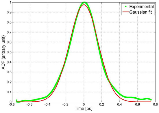 The auto- correlator was used with a pulse width measurement range of (10 fs–12 ps) and it was connected to the PC through USB and by using the APE’s Standardized Software Interface, allowing either remote control or integration into automated setups. Therefore, the deflected beam is tuned until the intensity is stabilized and maximized, and then, the pulse is acquired and the data analysis is completed by using the Gaussian fitting curve function cftool of MATLAB 2020.