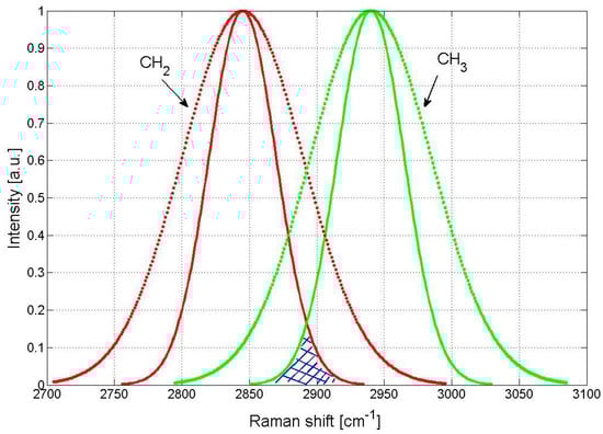 Over the past ten years, stimulated Raman scattering (SRS) microscopy has been investigated in nanophotonics [1,2,3,4] as well as in biophotonics as an analytical, label-free, non-invasive technique with unique cellular and tissue imaging capabilities [5,6,7,8]. As almost all the biomolecules contain carbon and hydrogen, the CH-stretching (2800–3100 cm−1) region of Raman spectra of biomolecules is the most used in SRS microscopy. The two Raman bands typically investigated are CH2, near to 2845, and CH3, near to 2930 cm−1, corresponding to lipids and proteins, respectively. Due to their large spectral shapes (about 100 cm−1) and the difference between peaks of 95 cm−1, the CH2 and CH3 are partially overlapped. Moreover, in the C-H region, the SRS signal level is high because the density of CH bonds is high, while the SRS molecular specificity is assumed to be low.