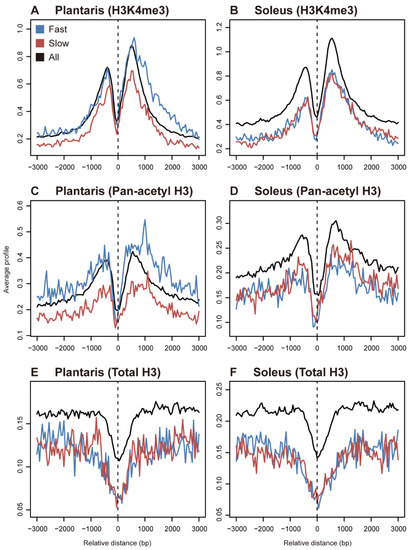 Different histone modifications in fast- and slow-twitch-specific genes of rat plantaris and soleus muscles. Distributions of transcriptionally active histone modifications, H3K4me3 (A,B), H3 acetylation (C,D), and total H3 (E,F) near the transcription start site (0 position) in the plantaris (A,C,E), and soleus (B,D,F) muscles were analyzed using ChIP followed by next generation sequencing. The distributions were averaged in fast-twitch-specific (blue), slow-twitch-specific (red), or all (black) genes. (A–D) were reproduced from Kawano et al. [21]. (E,F) were obtained from additional analysis of the results using the samples obtained from Kawano et al. [21].