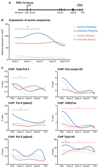 Different response of PGC-1α gene expression to exercise in rat plantaris and soleus muscles. (A) Rat PGC-1α locus showing the position of exons targeted for analysis. (B) Differential upregulation of exonic sequences between the plantaris (blue) and soleus (red) muscles. Note that the expression of proximal sequences was more enhanced in the plantaris muscle, indicating higher transcriptional activity than soleus muscle. †: p < 0.05 in the plantaris vs. soleus muscles after exercise. (C) Distribution of RNA polymerase II (Pol II) and histone modifications analyzed by ChIP-qPCR, and their changes in response to exercise. Note that the accumulation of Pol II in response to exercise was significantly induced at the proximal sequences in the plantaris muscle, in which histone acetylation was prevalent. *: p < 0.05 in control vs. after exercise in the plantaris (blue) or soleus (red) muscles. The maximum length of the continuous regions from the TSS was selected by one-way ANOVA (B,C). The data were obtained from Masuzawa et al. [22] and combined between plantaris and soleus muscles.