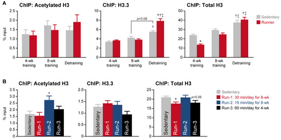 Nakamura et al. [25] reported that disuse atrophy was not induced in the hindlimb muscles of adult rats with prior running training experience in early life. They also found in RNA sequencing analysis of the plantaris muscle that a subset of genes that were upregulated in sedentary rats after unloading were less responsive in the rats with prior running training experience. The distribution of total H3 was significantly decreased at these loci during the training period (Figure 3A), suggesting that nucleosome formation was diminished by running training. The nucleosomes were restored after the detraining period, although the incorporation of histone variant H3.3 was noted in the rats with prior running training experience (Figure 3A). This result also shows that histone H3 is accumulated with age, independent of the experience of exercise training. Ohsawa et al. [26] further tested the effects of total amount or duration of running training on histone modifications in rat plantaris muscle. An exercise training-associated decrease in total H3 distribution was observed to be dependent on the amount of daily exercise when the ChIP-qPCR analysis was performed at the same loci targeted by Nakamura et al. [25] (Figure 3B). The results also showed that acetylated H3 accumulated during the running training if the total H3 distribution remained unchanged. These observations suggested that exercise training stimulated the dissociation of histones from nucleosomes as well as the exchange of histone components with newly synthesized histones such as H3.3, a phenomenon known as “histone turnover.”