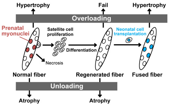 Initiation of embryonic and fetal myogenesis is preceded by the proliferation of Pax3-positive myogenic precursors [45,46]. During embryonic myogenesis, Pax3-positive cells migrate into the limb buds at E11–12, where most cells lack Pax7 expression [46]. Pax3 expression in the myogenic precursors is mostly downregulated before birth, and only a few cells in the lower leg muscles of adult animals appear to express Pax3 [47,48]. Previous studies [49,50] have also reported that Pax3- and Pax7-positive cells have a distinct function in regeneration. According to these observations, prenatal and postnatal cell sources might provide individual functions in the myonuclei after the differentiation into muscle fibers. We demonstrated that prenatally incorporated myonuclei in the transgenic mice with skeletal muscle-specific EYFP reporter expression driven by tetracycline administration persisted until at least 13 weeks of age, although these prenatal myonuclei were ablated by muscle regeneration after injury in adult mice [51]. We also tested the hypertrophic function in the regenerated fibers using the rat soleus muscle (summarized in Figure 5). Overloading by the tendon transection of synergists failed to induce compensatory hypertrophy in the regenerated fibers of adult rats, whereas unloading by tail suspension normally induced fiber atrophy. Loss of hypertrophying function correlated with the lowered histone acetylation at the Igf1r locus, which was one of the genes that did not respond to overloading in the regenerated muscle. These alterations in regenerated fibers were improved by the transplantation of cells harvested from juvenile soleus muscles of neonatal rats in association with enhanced histone acetylation at the Igf1r locus. These results suggested that prenatal myonuclei have a unique epigenetic feature that might enhance gene responsiveness to physiological stimuli later in the life.