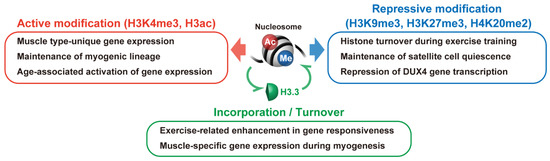 Epigenetic regulation in skeletal muscle adaptation to exercise training is a current topic of interest; however, limited information is available regarding this topic. DNA methylation at CpG sites is known to act as a transcriptionally repressive modification. Several previous studies [7,8,9] have reported that the hypomethylation at CpG sites in the DNA of the skeletal muscles is induced by a bout of exercise training, which in turn is associated with the upregulation of the expression of particular genes. Histone modification is also recognized as an epigenetic system that plays a crucial role in transcriptional activity in the cell nucleus. Methylation at lysine 4 of histone 3 (H3K4) and H3 acetylation typically marks transcriptionally active promoters and gene bodies in various cells [10,11,12]. For instance, the histones present at the MyoD-binding sites in skeletal muscle cells are acetylated during embryonic myogenesis, which allows MyoD to regulate the expression of skeletal muscle-specific genes [13]. However, limited information is available regarding the histone modifications and their role in the regulation of skeletal muscle characteristics in vivo. This review highlights the histone modifications induced in the skeletal muscles and their biological significance.
