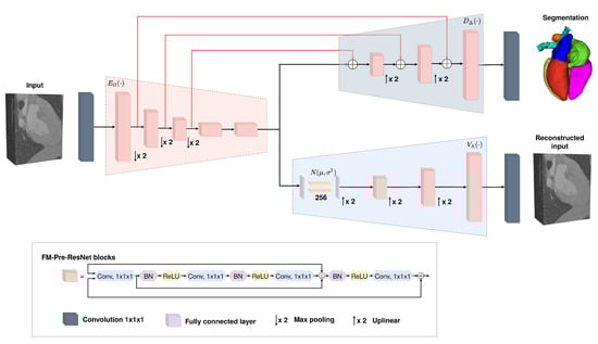 An illustration of proposed network architecture for the 3D whole heart segmentation. Input is a volumetric CT or MRI image. Each red block is the FM-Pre-ResNet block. The VAE branch is added at encoders’ output and is used only during training. The decoder stage creates the final whole heart segmentation.