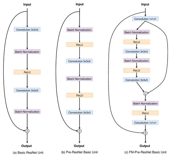 An illustration of different connectivity types of residual units. (a) original residual unit; (b) pre-ResNet unit; (c) proposed FM-Pre-ResNet unit