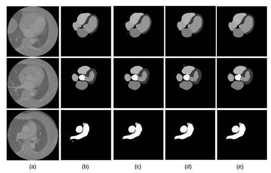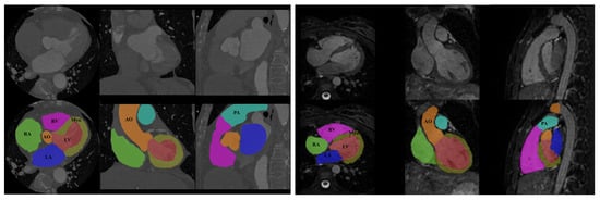 Various clinical applications require insights into different cardiovascular system structures. For example, whole heart segmentation is crucial for pathology localization and hearts’ anatomy and function analysis. The construction of patient-specific three-dimensional (3D) heart models and surgical implants greatly benefits pre-surgical planning for patients with atherosclerosis, congenital heart defects, cardiomyopathy, or even inspecting different heart infections in post-surgical treatment []. Whole heart segmentation includes delineation of four heart chambers, the entire blood pool, and the great vessels, which makes manual segmentation by clinical experts time-consuming and prone to observer variability. There is an increasing focus on developing accurate and robust automatic image processing methods. The development of accurate, efficient, and automatic image processing and analysis methods is a complex task, especially in the medical field. The main reason is in high variability in image intensities distribution and dynamic properties of cardiac structures. Nevertheless, the advancements and rapid development in image processing, computer vision, and artificial intelligence fields significantly facilitate this challenging task.