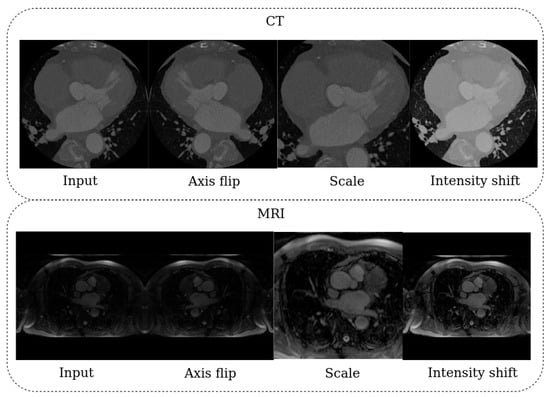 To alleviate the irregularities of variable contrast in some MRI images, we normalize all input images (both CT and MRI) to have zero mean and unit std. The volumes were cropped and zero-padded to a fixed size of to provide a fine ROI for the network input while making sure all heart structures are inside the selected ROI. We apply three different data augmentation methods on input image channels to increase the sample size of training data and enhance the robustness and generalization ability, namely random axis mirror flip, random scaling, and intensity shift. Random axis mirror flip creates a mirror reflection of an original image along one (or more) selected axis and is commonly flipped at a rate of 50%. Random scaling operation S scales input image and performs independently in different directions. Intensity shift performs an element-wise addition of a scalar to the image and affects the brightness of the original image. Details about parameters of used data augmentation methods are presented in Table 1 while examples of input images after applying different data augmentation methods are shown in Figure 4. Moreover, we empirically found that advanced augmentation techniques, such as random histogram matching, or random image filtering, do not show any additional improvements to the final segmentation result.