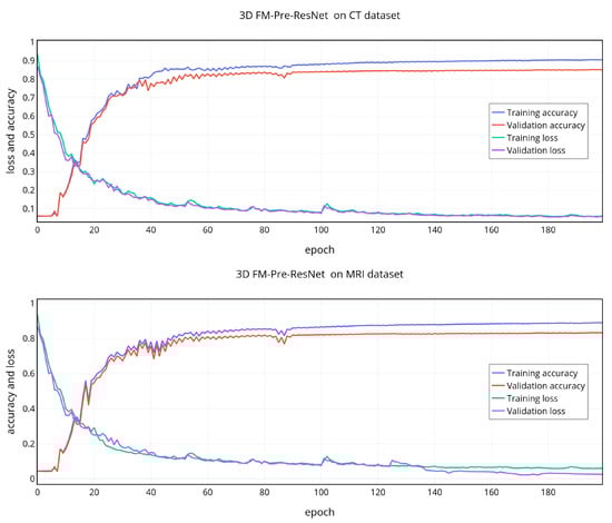 In our experiments, we train four encoder–decoder based architectures: (1) 3D Pre-ResNet without VAE regularization, (2) 3D Pre-ResNet with VAE regularization, (3) FM-Pre-ResNet without VAE regularization, and (4) FM-Pre-ResNet with VAE regularization. All four networks are trained from scratch and separately for CT and MRI images. The whole experimental procedure is implemented in Pytorch and trained on two NVIDIA Titan V GPU simultaneously. The source code of our method is available at []. Our training and validation dataset consists of 20 CT volumes and 20 MRI volumes, with – training and validation split, respectively. The trained networks are evaluated using a testing dataset that includes 40 subjects for both CT and MRI images. The proposed 3D FM-PreResNet + VAE architecture produced the highest validation accuracy of 94.40% at the end of the 200th epoch. The network is trained for 200 epochs since further training appears not to decrease validation loss as shown in Figure 5. Moreover, Figure 5 shows that, with an increase in epochs, the loss value decreases, and the accuracy increases. This is a clear indication that the network is successfully learning from the input data.