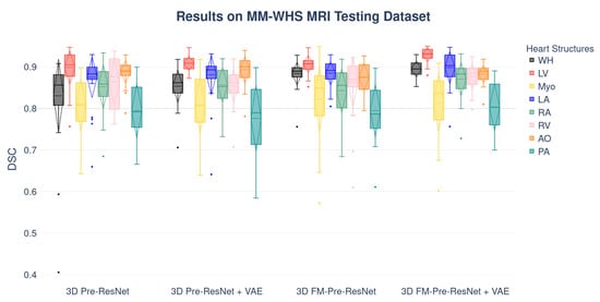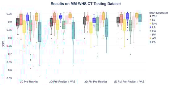 Boxplots showing the distribution of the DSC for WH, LV, Myo, LA, RA, RV, AO, and PA using different segmentation networks on MMWHS CT and MRI testing datasets are presented in Figure 6 and Figure 7, respectively. Additional, structure-wise segmentation accuracies for the LV, RV, LA, RA, Myo, Ao, and PA, for both CT and MRI images, are summarized in Table 3 and Table 4.