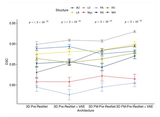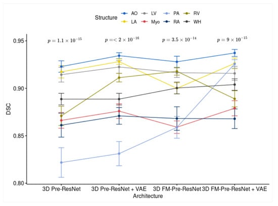 Comparison of Wilcoxon rank sum test of each heart structure for different architectures on the MMWHS MRI testing dataset.