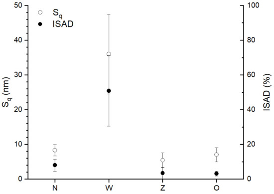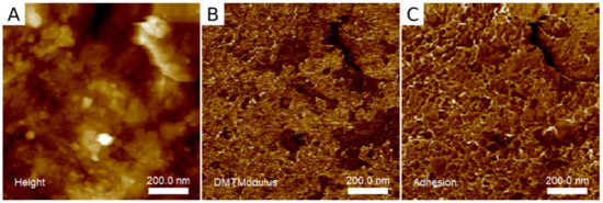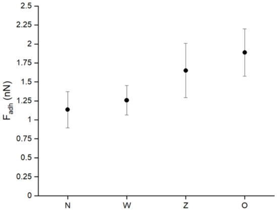 (3) Fam: mean adhesion force—the force of attraction between the scanning blade and the surface averaged over the image are presented in Figure 4.