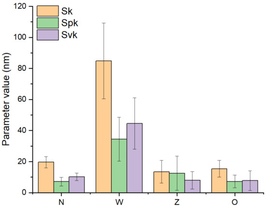 Graphs showing the values of functional parameters of the surface texture describing thicknesses of the surface components: core (Sk), peaks (Spk) and valleys (Svk).