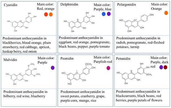 Anthocyanins are nontoxic pigments, soluble in aqueous food systems, and belong to the flavonoid class. Apart from imparting food color, anthocyanins possess a broad array of biological activities and therapeutic effects, such as antimicrobial activity, antioxidant protection, anti-inflammatory, antidiabetic, antiobesity, and anticarcinogenic impacts [2]. These phenolic compounds are responsible for brilliant colors ranging from pink, red, and orange to blue in flowers, seeds, fruits, and peels of numerous plants [3]. Anthocyanins possess a C6–C3–C6 basic skeleton (flavylium cation) and consist of an anthocyanidin (aglycone unit) linked to sugar, typically at the 3-position on the C-ring and methoxyl and hydroxyl groups [4]. Up to now, 23 types of anthocyanidins have been recognized and their structures can differ in terms of the substitutions at positions 5′ and 3′. The most widespread and commonly occurring aglycon forms (anthocyanidins) in fruits and vegetables are cyanidin, delphinidin, pelargonidin, peonidin, malvidin, and petunidin (Figure 1), with distributions of 50%, 12%, 12%, 12%, 7%, and 7%, respectively [2]. The solubility of anthocyanins in water, ethanol, and to some extent, in methanol depends on the presence of sugar(s) and hydroxyl groups on the rings [5]. The most prevalent sugar linked to anthocyanidins is glucose, while arabinose, galactose, rhamnose, and rutinose have also been detected. These sugars could also be acylated with various aliphatic/aromatic acids [6]. The number, type, and position of the attached sugar; the position and number of methoxyl and hydroxyl groups; the number, nature, and extent of organic acids linked to the sugar lead to the various structure of the anthocyanin molecules [7]. The incorporation of anthocyanins into food systems yet faces technological obstacles in the food industry, as these promising molecules are unstable and highly likely to degrade in the presence of light and oxygen, high temperatures between 100 and 121 °C, and slightly acidic to neutral conditions, resulting in poor bioavailability and color fading during processing and storage [5,8,9].