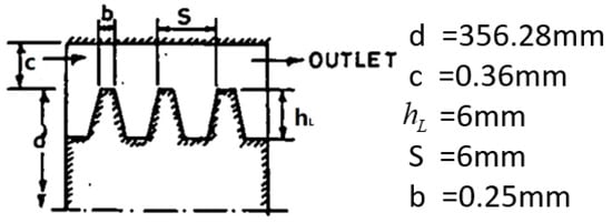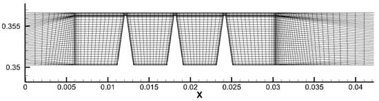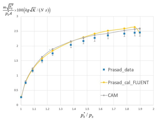 In the calculation of labyrinth leakage flow, the accuracy of CAM is validated by the data of Prasad []. Prasad et al. tested the straight-through labyrinth shown in Figure 2, and obtained the flow characteristics of the labyrinth under 12 working conditions (pressure ratio from 1.0031 to 1.8974). See reference [] for details of test pieces and test equipment. For the case that the clearance between the labyrinth teeth Cl = 0.36 mm, they also calculated with Fluent. The calculation results of CAM are compared with their experimental results and Fluent calculation results.