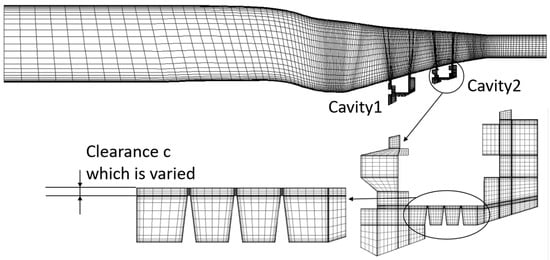 Last but not least, the simulations of full-engine in the literature mentioned above have not included the SAS, which is known to have a considerable impact on the engine performance []. As a part of the SAS, seal cavity leakage flow occurs in the seal cavity at shrouded stator root (in compressors and turbines) or shrouded rotor tip (usually in turbines). Figure 1 shows the seal cavity leakage in a compressor with shrouded stator. Although the flow exchange between the main channel and the cavity below the axial gap is often suppressed by engineering measures such as a labyrinth seal, it is difficult to fully eliminate the leakage from the axial gap. In recent years, more and more studies have shown that seal cavity leakage flow will obviously deteriorate the performance of axial compressor and turbine in aeroengines, and such influence cannot be ignored. Usually, for every 1% increase in seal-tooth clearance-to-span ratio, the decrease in pressure rise is 3%, and the reduction in efficiency is 1% [,]. As a reference, a usual relationship between efficiency deterioration and blade tip clearance in an axial compressor is that the compressor efficiency decreases by 1.5% when the rotor tip clearance increases by 1% with respect to the span [,,,]. For a cantilevered stator, the decrease ranges from 1.0% to 2.0% [,,]. Mahmood and Turner [] investigated the effect of seal cavity leakage flow on 1.5 stages of a 10 stage axial flow compressor. Numerical results indicate 0.86% efficiency reduction for a seal clearance of 1.3% span. Kato et al. [] have performed a full three-dimensional unsteady calculation for a high-speed six-stage advanced axial-flow compressor. The calculation results with a sealed cavity under the stator blade reduce the efficiency by 1.7% compared with the results without a cavity. Similar to compressors, losses caused by leakage through the shrouded cavity contribute significantly to the overall losses of turbines []. Rosic et al. [] compared experimental data and numerical simulations in a three-stage turbine and pointed out that calculation of the leakage flows and cavities is necessary in order to get good agreement between calculation and measurement. The flow in a two-stage LP-turbine at relatively low Reynolds numbers is simulated by Kuerner et al. [] with an in-house 3D code. The overall isentropic efficiency derived from computations with cavities lies within 0.2% of the experimental result, and that is 1.3% closer than computations without cavities.