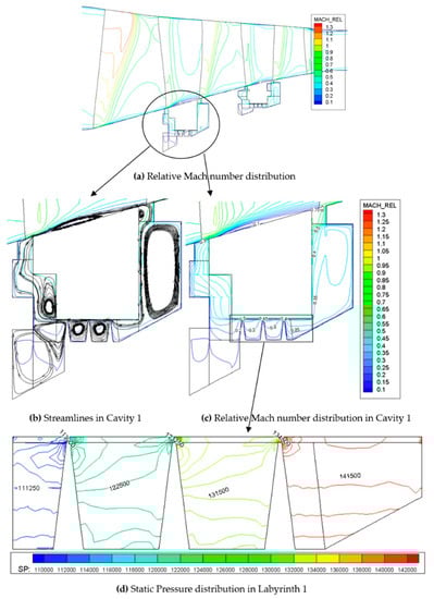 Figure 8 shows the flow field at near-stall operation point of configuration 4 of the compressor with seal cavity leakage flow. Figure 8b shows that, forced by pressure difference, the leakage flows into the seal cavity from the stator trailing edge gap, and then flows into the mainstream from the stator leading edge gap after dissipated in vortex form for many times. It can be seen from Figure 8c,d that the labyrinth (the part marked with black box in Figure 8c) is the main sealing part in the cavity flow. When the leakage flows through the labyrinth tip clearance, the flow path contracts, the velocity increases and the static pressure decreases. After passing through the tip clearance, the flow path expands rapidly. The kinetic energy of the fluid dissipates in the cavity between the teeth, during which the velocity decreases, and the pressure change is not obvious. After that, the fluid enters into the next labyrinth tip clearance, and the above process is repeated. After the leakage flow through the multi-stage labyrinth structure, the pressure is significantly reduced, and the sealing process is completed. Such a low-energy leakage flow converges into the main stream at the leading edge of the stator, causing losses by mixing with the main stream. As a result, the flow field at the root of the stator is affected and a low Mach number region is formed.